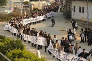 乌坎村居民打出横幅、高呼口号集会抗议 2011 12 19.