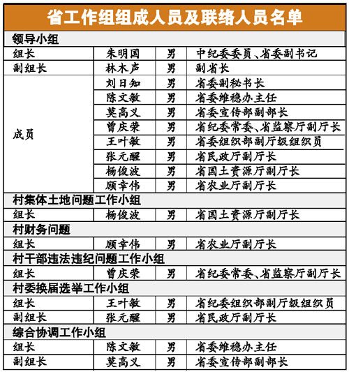 自9月21日“乌坎事件”发生以来,中央和省委、省政府始终高度重视。省委多次听取汇报和研究部署处置工作,省委书记汪洋对依法依规处置事件及时作出重要指示。这次成立的省工作组,由朱明国任组长,林木声任副组长,从省直各部门抽调了九名厅级干部和一批业务骨干参加。根据群众的诉求,省工作组设村集体土地问题、村财务问题、村干部违法违纪问题和村委换届选举问题等专项工作组,每个专项工作组都公布联系电话,随时倾听乌坎村民的诉求。