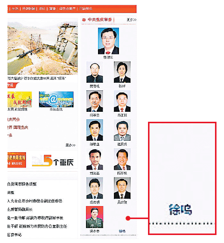 在重庆官方华龙网的领导人介绍栏目,昨天只有徐鸣的名字,但既无相片也无简介连结。(网上图片)