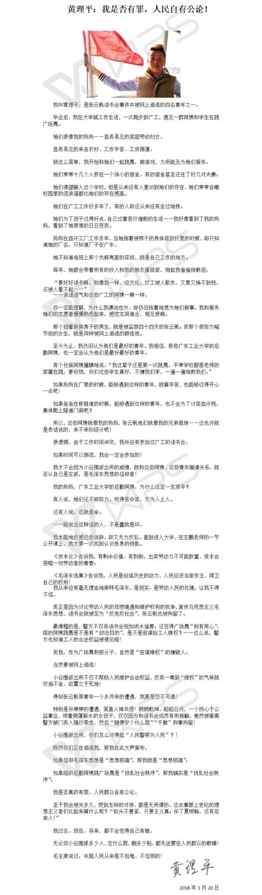 【编者按:最近发生了广州小谷派出所抓捕张云帆发起的马克思主义毛泽东思想读书会事件,该事件引起左翼网络的普遍关注。现转载其中几名读书会成员的声明。希望读书会的青年像高尔基写的海燕一样,勇敢地与工人相结合,为无产阶级的解放做斗争!】