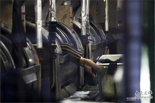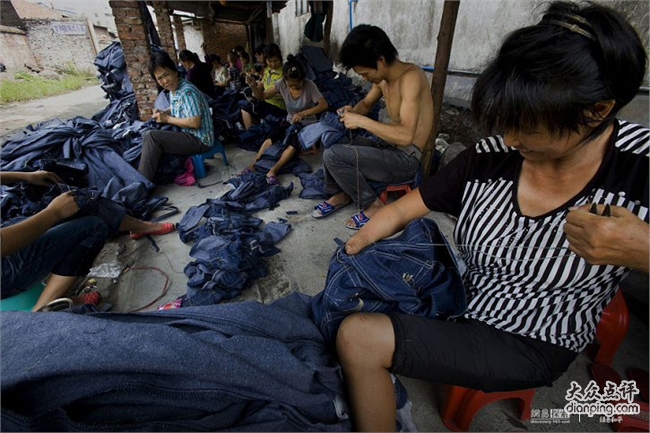 4、在这里,不管是商铺门市,还是乡村的民宅,随处可见正在手工处理牛仔服装的工人和村民。从早到晚,都有工人把一堆堆的牛仔服装或布料从厂房的二、三楼抛到地面,再送上货车。图为工人正在简陋的大棚里加工牛仔裤。