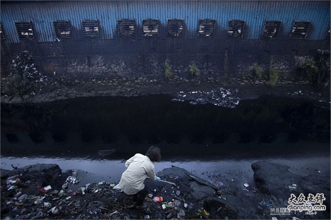 6、绿色和平的工作人员正在新塘镇大敦村附近一条被污染的河流边调查。村民们反映说,排污严重的时候,这里的河水简直已经不是污水,而是毒水。味道恶臭刺激,如果不小心接触到,皮肤还会发痒甚至溃烂。
