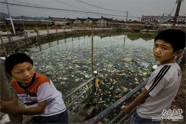 25、谷饶镇的孩子在漂满垃圾的水塘边玩耍。当地的村民刘武生(化名)说:“小的时候这条溪里可以游泳的,还有鱼,现在我的儿子不会游泳了,没有地方学,水太脏了,平时村里人碰都不会碰。