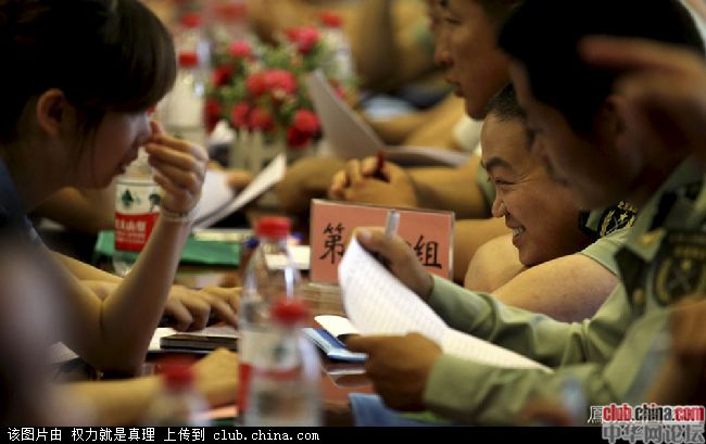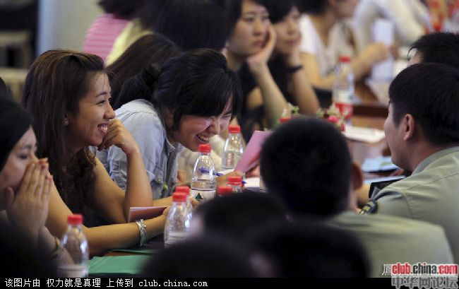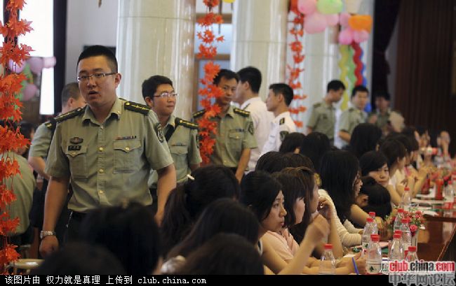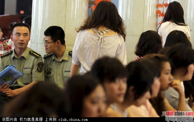按:小姐遇到兵,好赖分不清。 北京晨报讯 2011年6月11日,一向严肃神秘的北京卫戍区里热闹非凡,连门口的哨兵都满脸笑容,眉飞色舞。200多靓丽大方的女青年风姿绰约地走入卫戍区礼堂,与早已等待此处的年轻军官相亲。潘之望摄/CFP供图