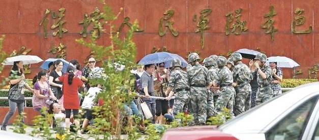 昨日在驻港部队深圳基地门外,请愿的军眷和抢横额的士兵一度发生推撞拉扯,多人倒地 。