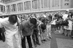 “砸碑”五青年站成一排向人们鞠躬致谢。晨报记者 王颖/摄