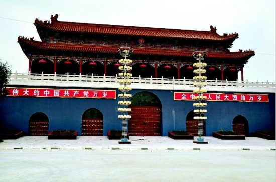 私企仿照天安门建大门 楼中间悬挂诸葛亮头像