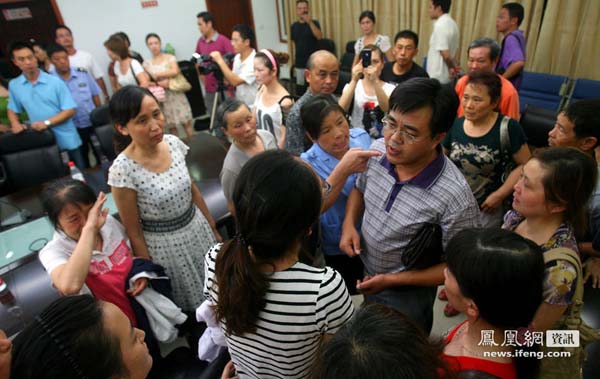 家属围着谢业新的领导公安县纪委副书记管浩祥提出质疑和讨要说法