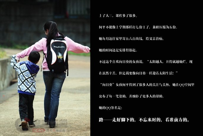 人们称亲切的称何平为“向日葵女孩”。其实她是一个有向日葵精神的孩子。在她的心中充满了阳光。在红网有几个关于她的图片。一个是9月19日下午4时20分,离上课还有10分钟,何平趴在桌子上。在这看到孩子睡的十分的安详,但是一定是在闭目养神。她说哪怕睡上5分钟,精神也会好很多。是啊,最多的时候兼职7份工作,那一份工作不消耗体力和时间,对于一个大三的学生来说,她能有这么大的精力吗?可是“穷人的孩子早当家”,她在这样的环境中不但挣钱养这个家,每月给家中寄去500—600月的生活费,而且还为了减轻负担,把弟弟接来,让他在自己身边。