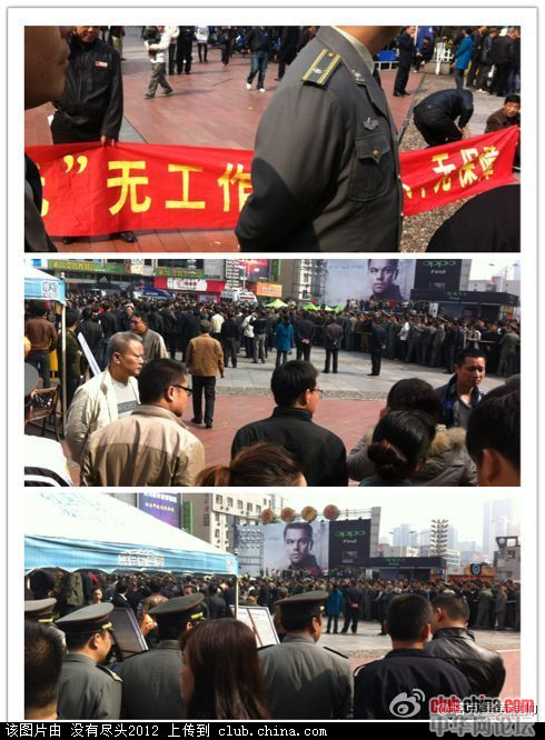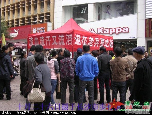 昨天(星期日),退伍军人们再次来到步行街中心广场打着横幅进行抗议,广场周围来了大批的特警,退伍军人们的语言也很动人,“我们的今天就是你们的明天,我们的年龄就是你们父母的年龄”,特警没有主动向前,后来只是在官员们的推动下才出手将横幅抢走,没有发生任何冲突。不过这个过程至少有上万人看到了,很多市民谴责当局流氓行为,还有市民给退伍军人送来了矿泉水表示支持,退伍军人们的维权行动还没有结束,还会继续。