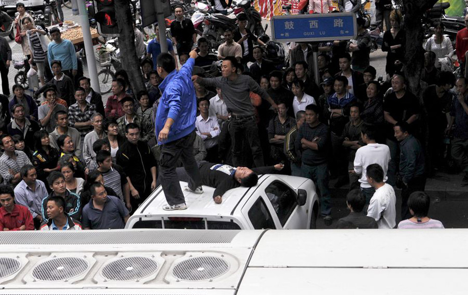 11月1日中午,福州鼓西路与达明路之间,一名20岁的安徽男子横躺在一辆皮卡车车顶上,哭喊着声称“城管打人”,现场有许多“被打者”的老乡在抗议.。