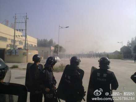 头带帽子,身穿防弹衣,左手拿大盾,右手拿T形刚棍(最少来了千余人)。。。这些特警下车就全部小跑到村民和当时警查打架的地方和他们打起来了,村民们毕竟没有经过特殊训练,手里拿的都是铁棍,木棍,农用工具和这些特警打起来当然是吃亏了,好多村民打不到特警,在前面的村民好多都被打的头破血流,有的打的躺在地上,警查直接从他们身上踩过去打别的村民,于此同时6点左右,当时的警查就把这个村庄和我们这个是村民土地的工业区包围了,从工业区入口高速公路下路口封锁了,拉了警戒线,车辆不得前进只准掉头,在从工业区的后面那个同茂工业区入口路口封锁了,