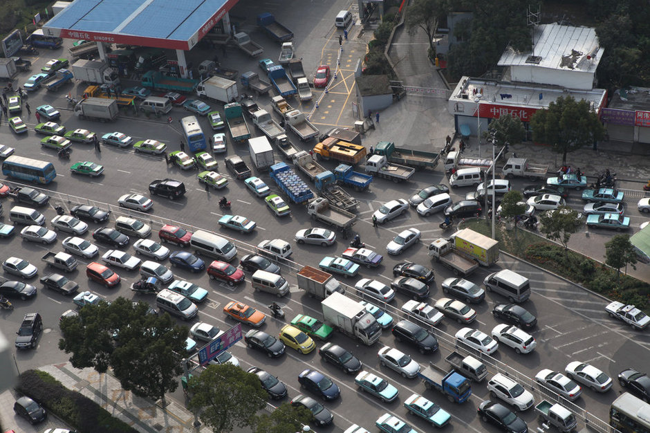 2011年12月04日,浙江台州市椒江区金三角加油站前,车子们排起长队等加柴油。近一个月时间,台州多个加油站出现柴油断供情况,加油站限额配给的柴油只够供应两小时左右,不少车子为了加到油提早两三小时前往加油站等候。