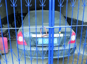 12月1日,这辆北京现代轿车仍然停在灵官镇派出所的车库里。车上有一层灰尘,左右两侧均贴着封条,驾驶室一侧的前门没有窗户。